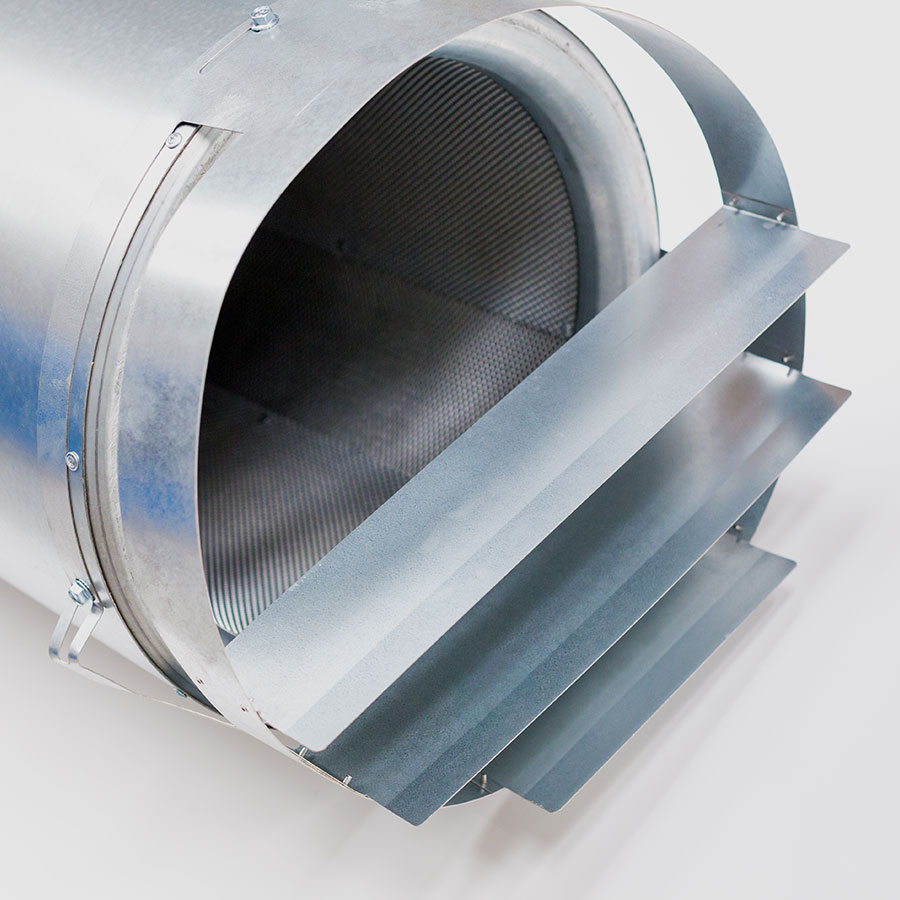 Fan casing parts are heavy gauge mild steel sheet, roll formed and welded, then hot dip galvanised to BS EN ISO 1461 after fabrication, or pre-galvanised sheet to provide a long lasting and robust construction. Flanges are roll formed as part of the casing. Silencer casings are rolled galvanised steel, attenuation is achieved with sound absorbing infill retained in the attenuator casing by a perforated liner.