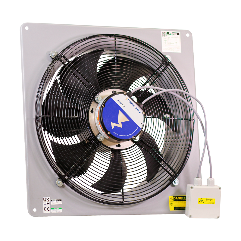 Motors are highly efficient, lightweight external rotor motors, insulated to Class F, with integral thermal overload protection. Sizes 250-350 weatherproofed to IP44 Sizes 400-710 weatherproofed to IP54. All fans are suitable for use with a speed controller. Electrical connection to the motor shall be provided by an IP55 terminal box fitted to a flying lead allowing the fan to be positioned conveniently to incoming electrical inputs.